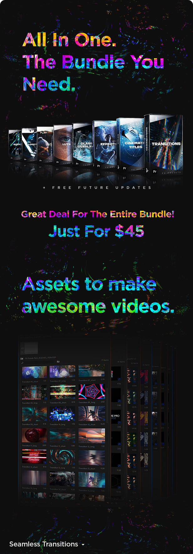 超过1500种令人难以置信的转场,标题,视频效果,叠加,预设和声音效果,旨在使您的视频看起来和声音更出色