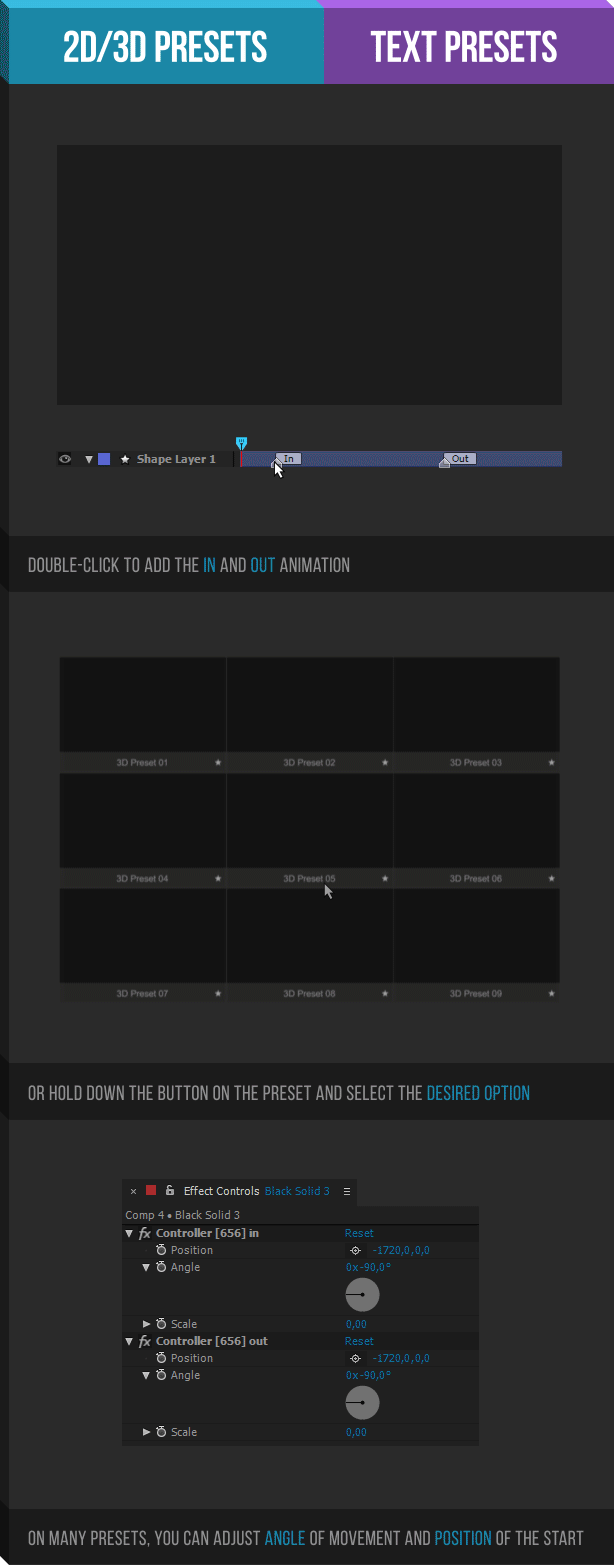 运动预设(必备):179个2D运动预设+248个3D预设+354个文字动画预设