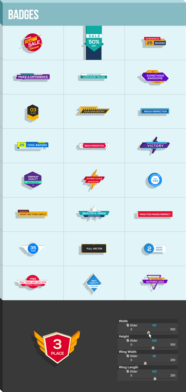 AE扩展脚本形式,可以快速生成各种MG动画元素,一共超过1850种元素,所有元素的颜色,动态,大小,三维效果等都可以修改处理,具体包括: