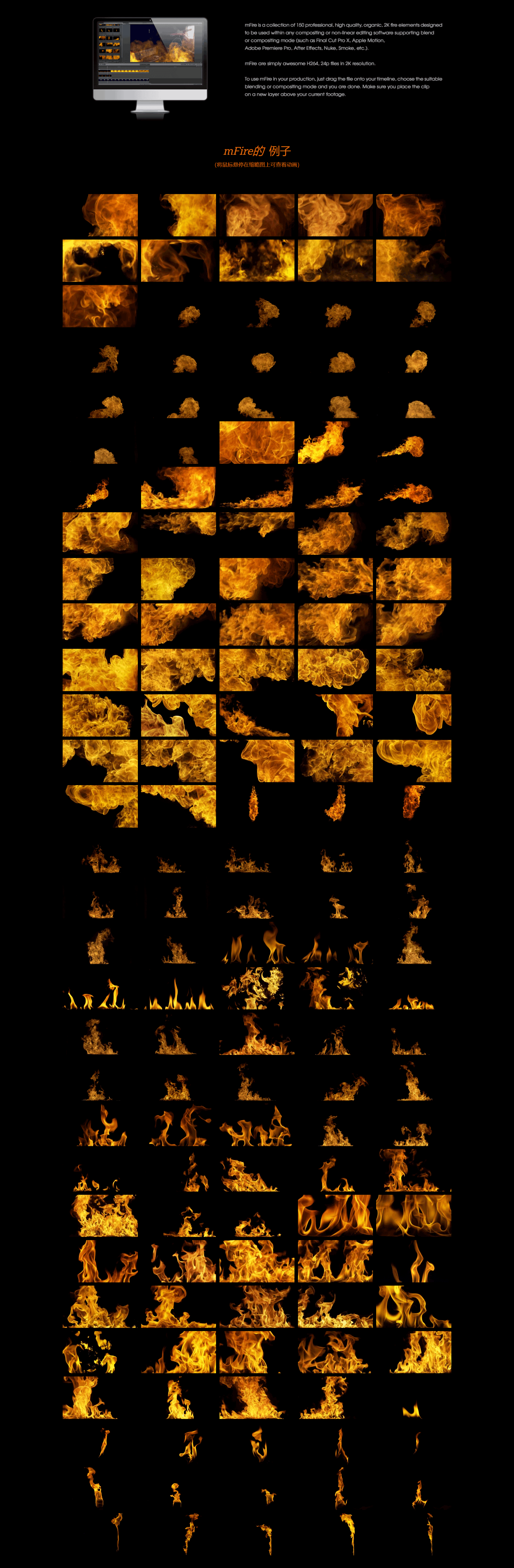 这套素材能为你的视频画面增加观赏性和镜头感,给你的后期带来更多的乐趣。 mFire 视频包共收藏 128个 专业、高质量、运动的 2k火焰元素,我特效合成用必不可少的素材,能用于很多特效类制作中,绝对能给你带来意想不到的震撼。效果直观真实,渲染速度快。多种效果动画能满足你众多的场景合成。