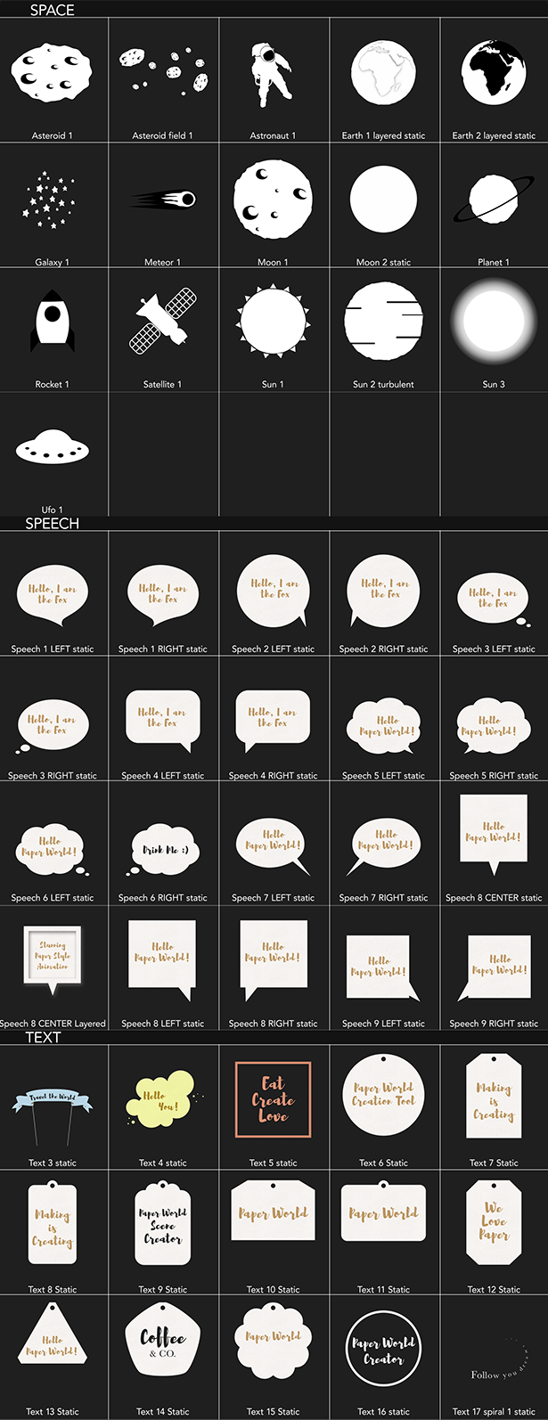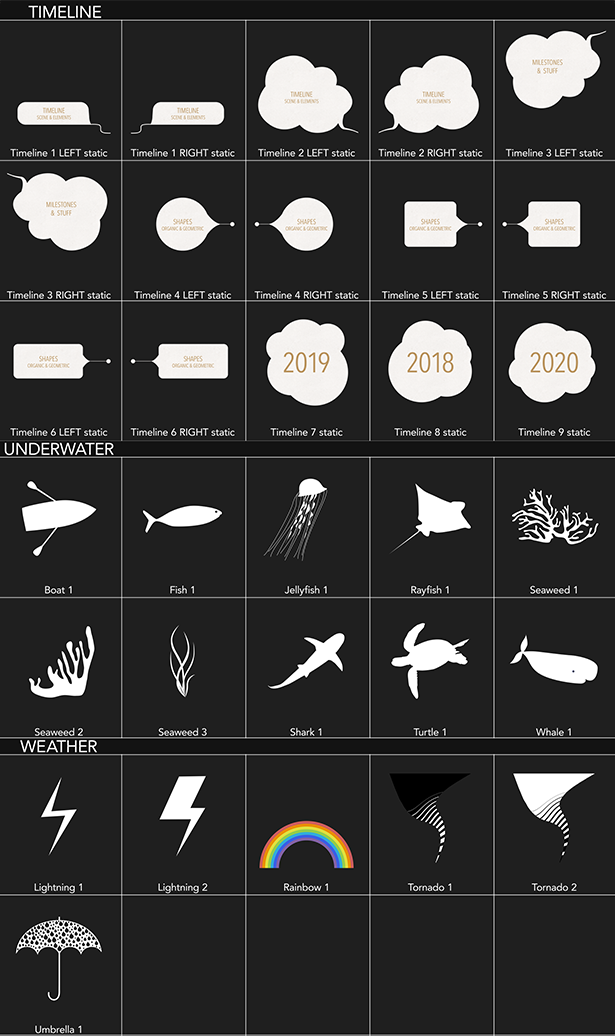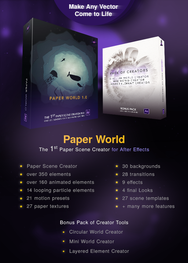 包含27个制作好的场景动画+350个小元素+14个循环粒子背景+41个运动预设+27张纸张材质+30个背景+28个转场+9个特效,元素可以自己随意搭配,制作自己的场景动画
