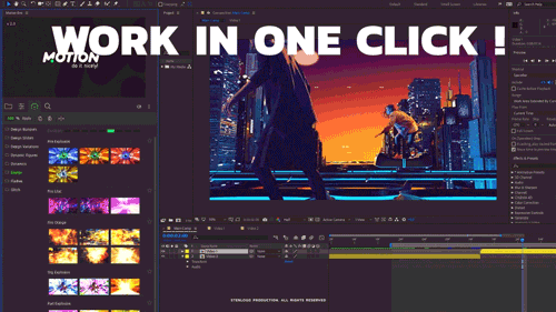 包含220组图形切割、图形转场、能力扭曲、扭曲冲击、信号损坏等多种AE转场预设,包含AE模板和脚本形式,两者任意使用一种均可,转场时聚焦的点可以任意切换,使用简单