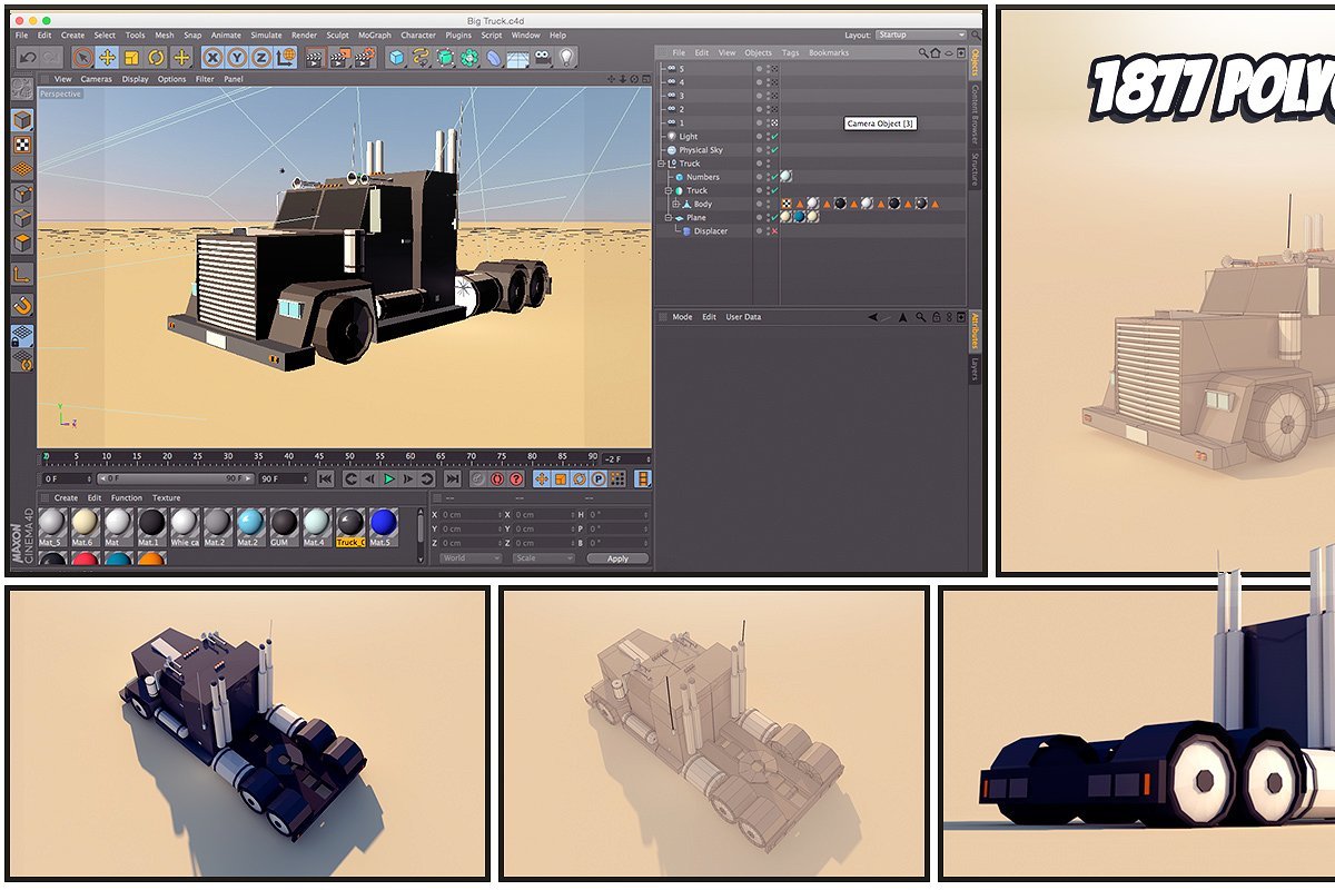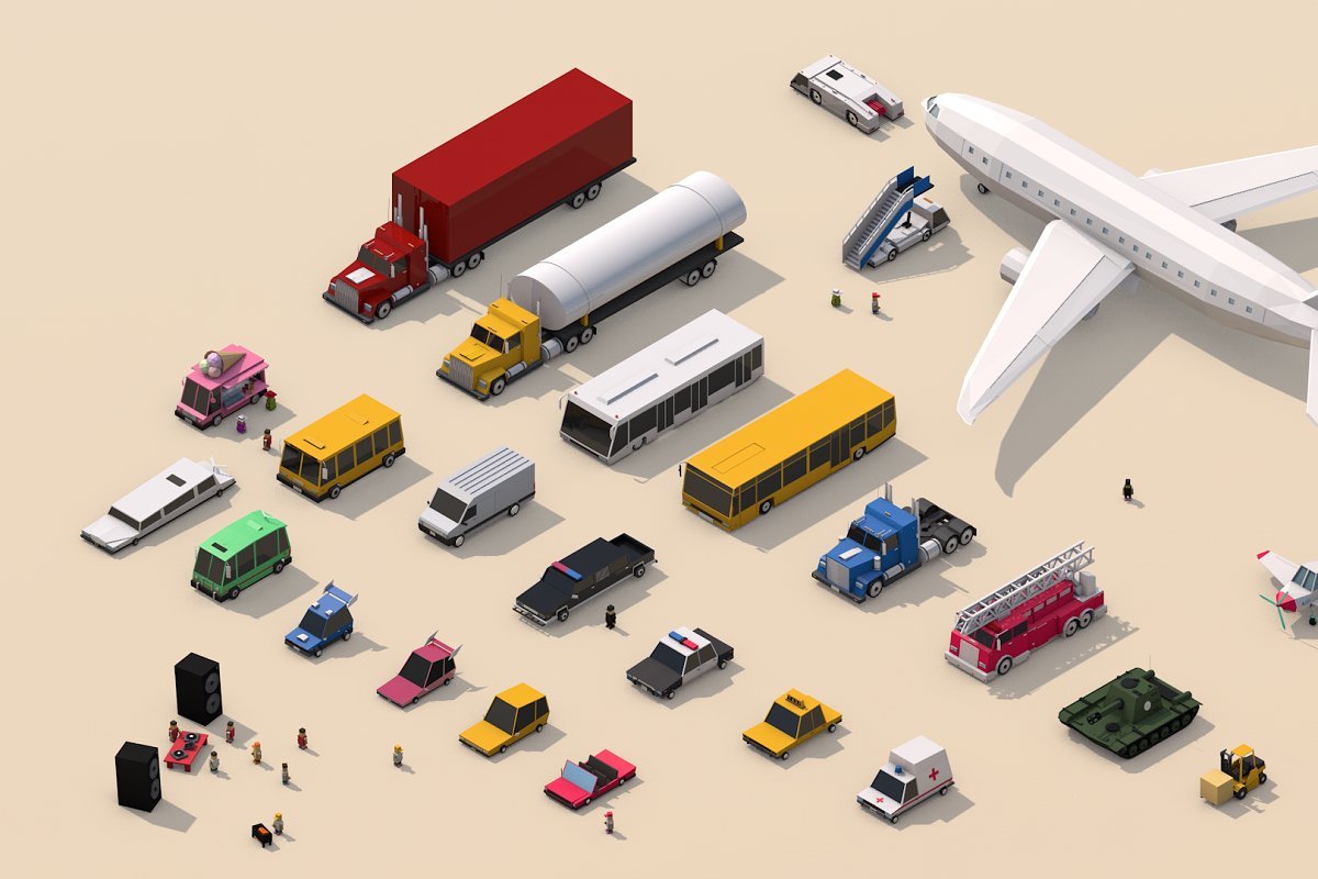包含25个低多边形风格汽车/飞机/交通工具模型,包含C4D/3DS/FBX/OBJ格式,打开即可直接使用