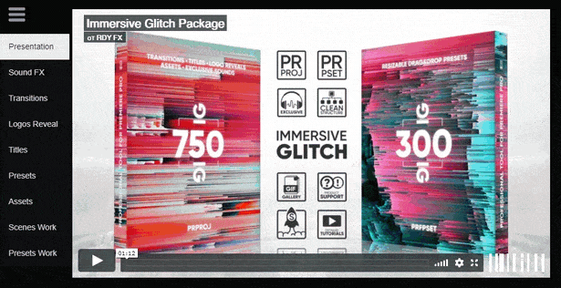 适用于Premiere Pro CC的故障转换,预设,标题,徽标,资产,Sound FX包。全面的工具,可在Premiere Pro CC 2018中创建高质量的视频效果。