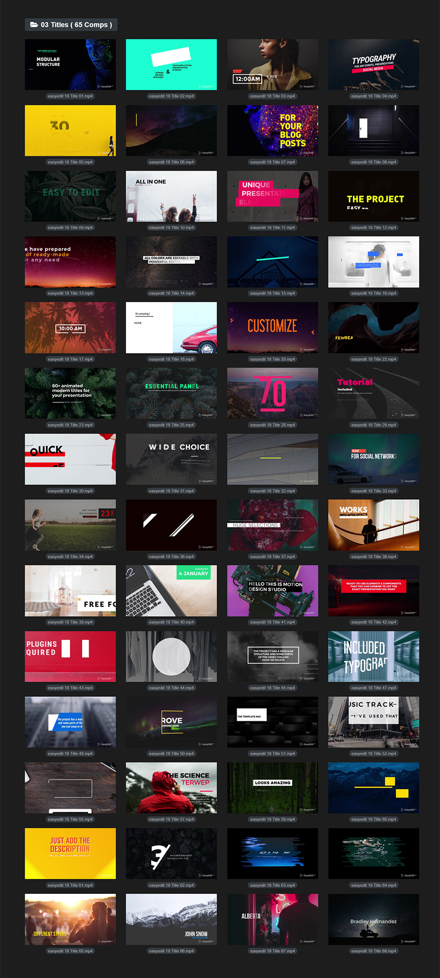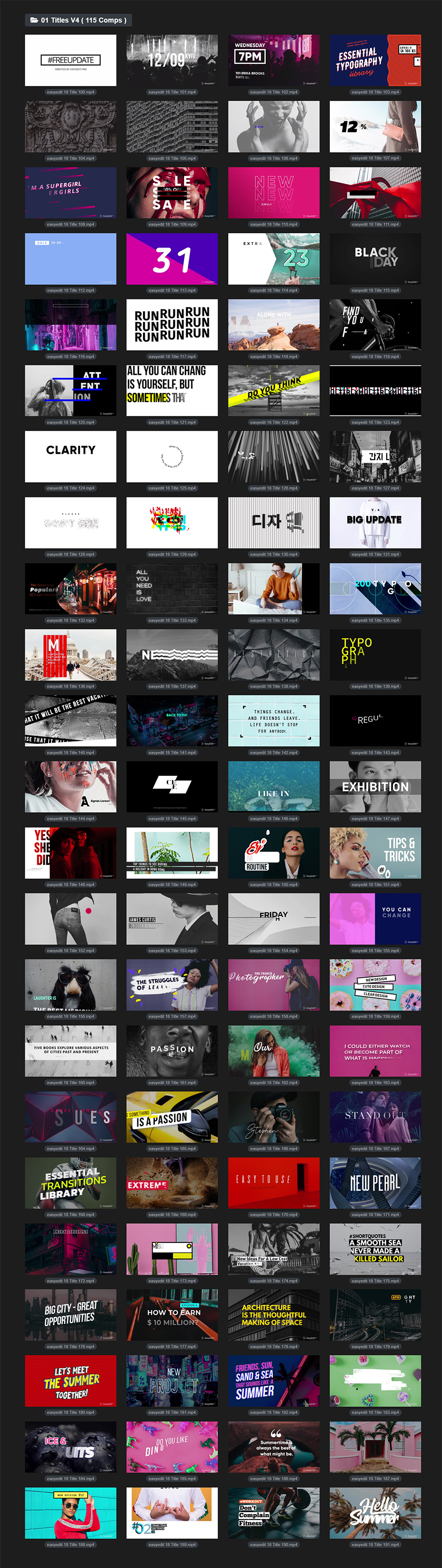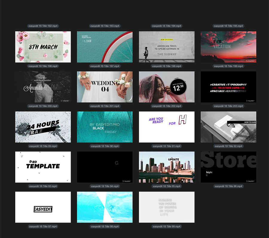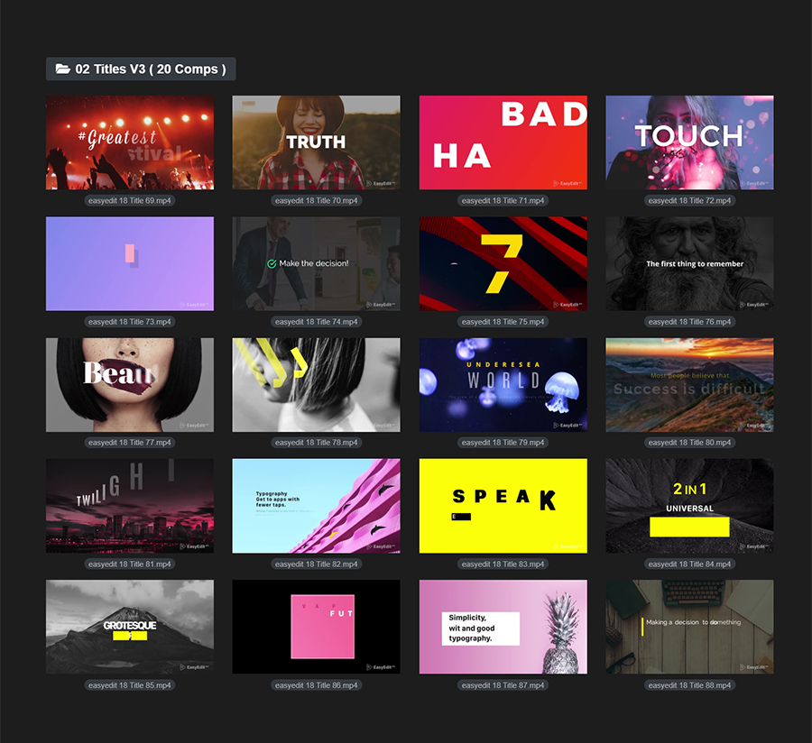 本套包含12组背景+9组新年风格文字标题+191组文字标题动画,全部都可以在AE或者PR中使用,更新到V5.2版本,增加EasyEdit Viewer脚本形式,在AE中可以通过EasyEdit Viewer扩展脚本来调用,直观方便,非常适用于框标题,企业标题,创意,优雅,必要的图形,instagram,动力学,低三分之二,最小,Premiere,字幕,文本,文本动画,标题,类型