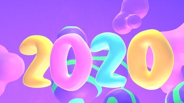 酷又有趣的2020年新年快乐问候动画。漂浮在天空和条纹的五颜六色的3d数字仿造云彩。