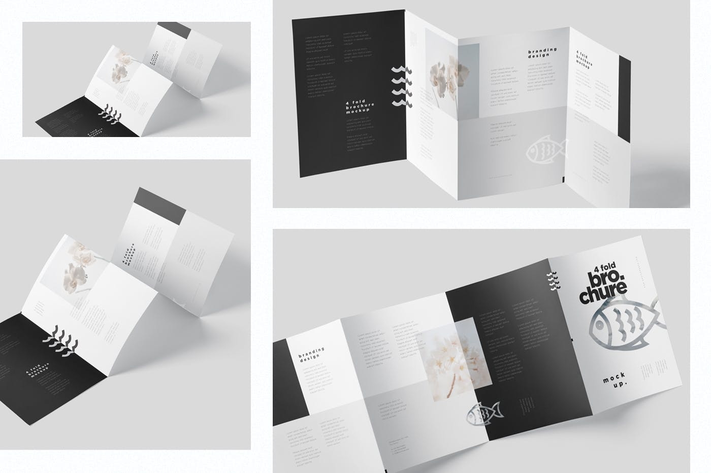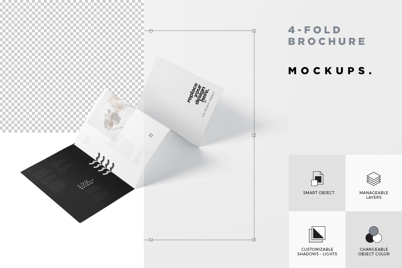- 折叠式传单样机,具有4个带有单独设计选项的面板。