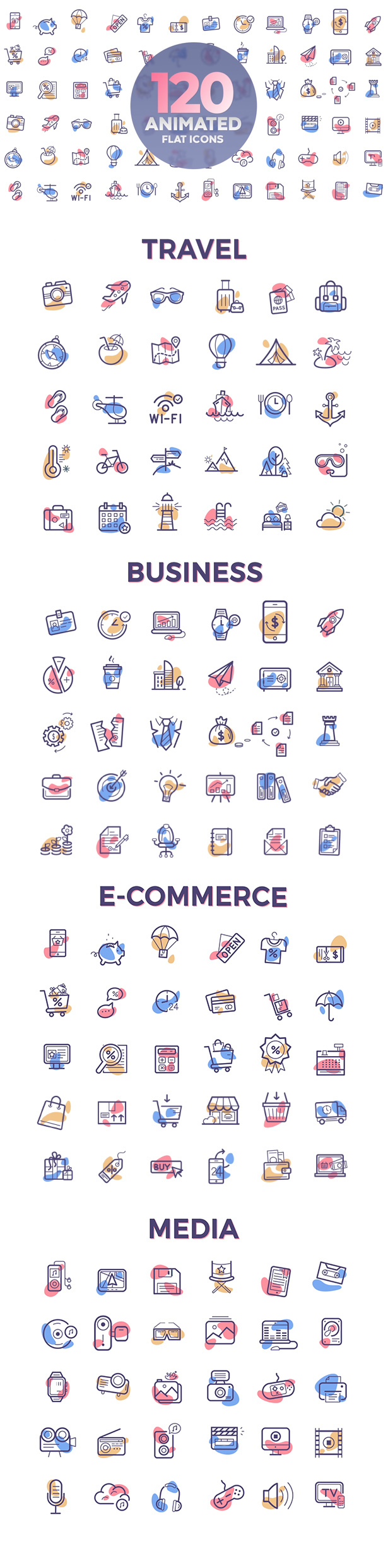 平面动画图标套件包含120个动画图标,具有现代时尚的设计。这些简单易用。只需拖放编辑即可享受。设置零件的动画,循环和动画。每个图标包括:部分动画,循环部分,部分动画。