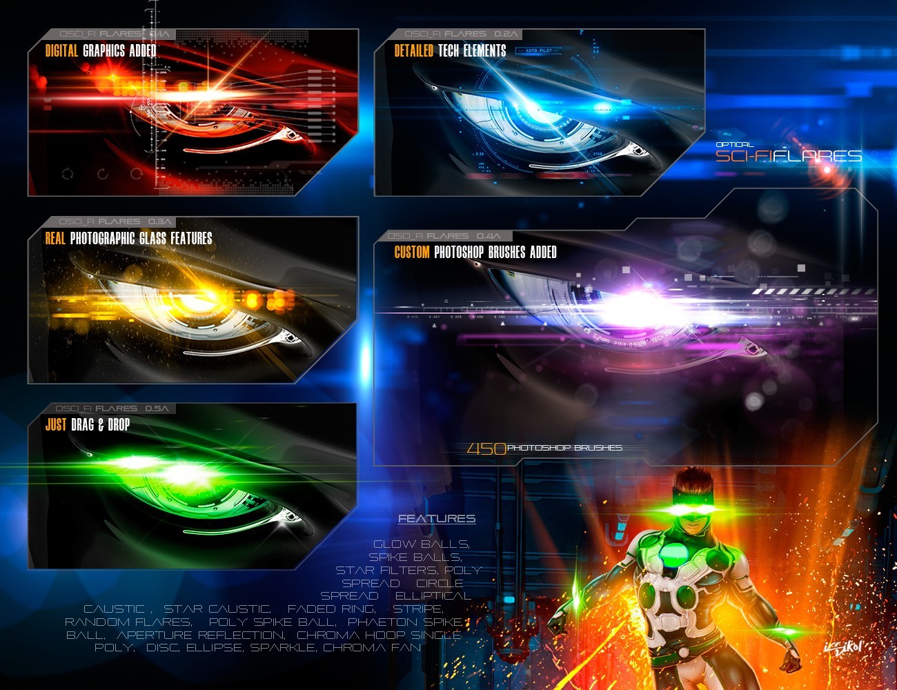 很高兴为您带来这个令人兴奋的Sci-Fi Optical Flare特殊效果包。哇!这里有很多创造性和有用的东西。该套装配有450多种定制的photoshop笔刷,这些笔刷具有创新的光晕附加元素,以及在界面中提供的未来派技术数字图形,以及165个现成可用的photoshop层的彩色高能光晕,它们具有真实的玻璃伪像,创造性的模糊效果和技术添加了一些东西以完成此设置。