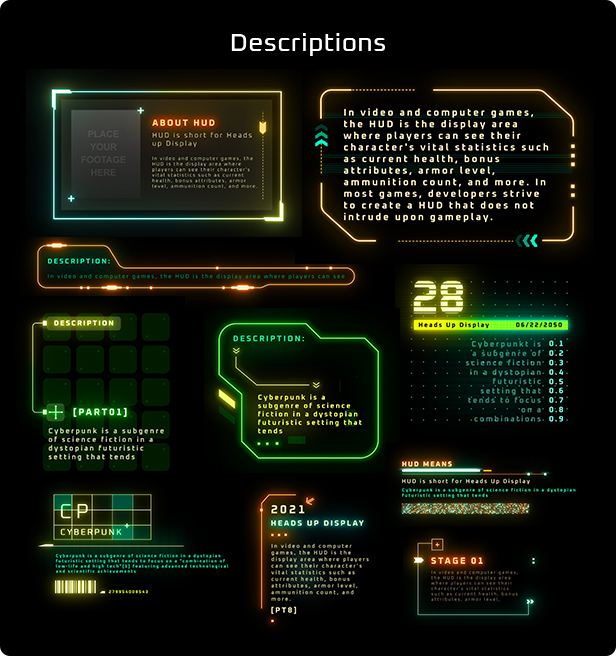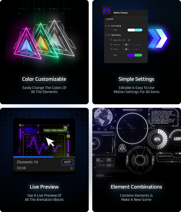 您必须已经听说了赛博朋克吧?!如果您不知道我们在说什么,只需在Google上进行搜索即可。那么,为什么不创建视频以跟上潮流呢?这个包是初学者和专业人士的完美选择。After Effects动画模板可帮助您制作具有超酷动画形状,赛博朋克和Hitech HUD元素的视频。您可以在After Effects中轻松混合,匹配和自定义所有这些模板。